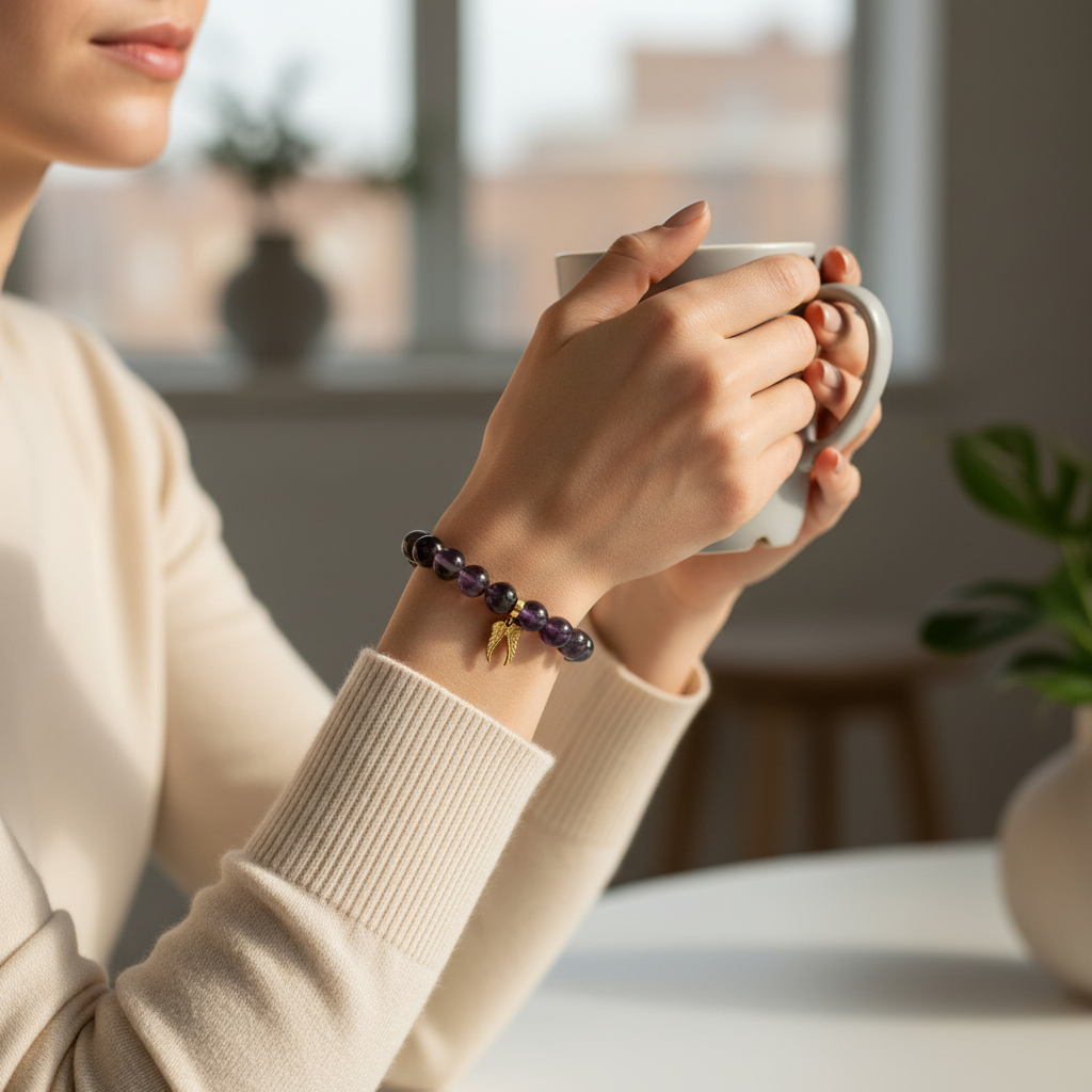 Materials: Natural Amethyst (10 mm), gold-plated 925 silver angel wings charm, stretch cord