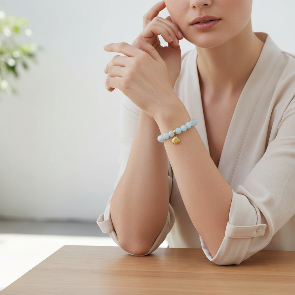 Materials: Natural Aquamarine (10 mm), gold-plated 925 silver shell charm, stretch cord