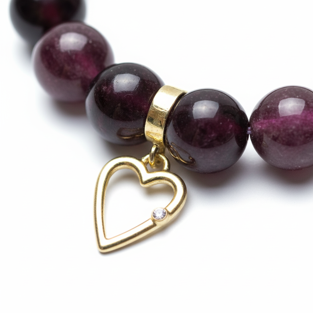 Natural Garnet (10 mm), gold-plated 925 silver heart charm with zircon, stretch cord